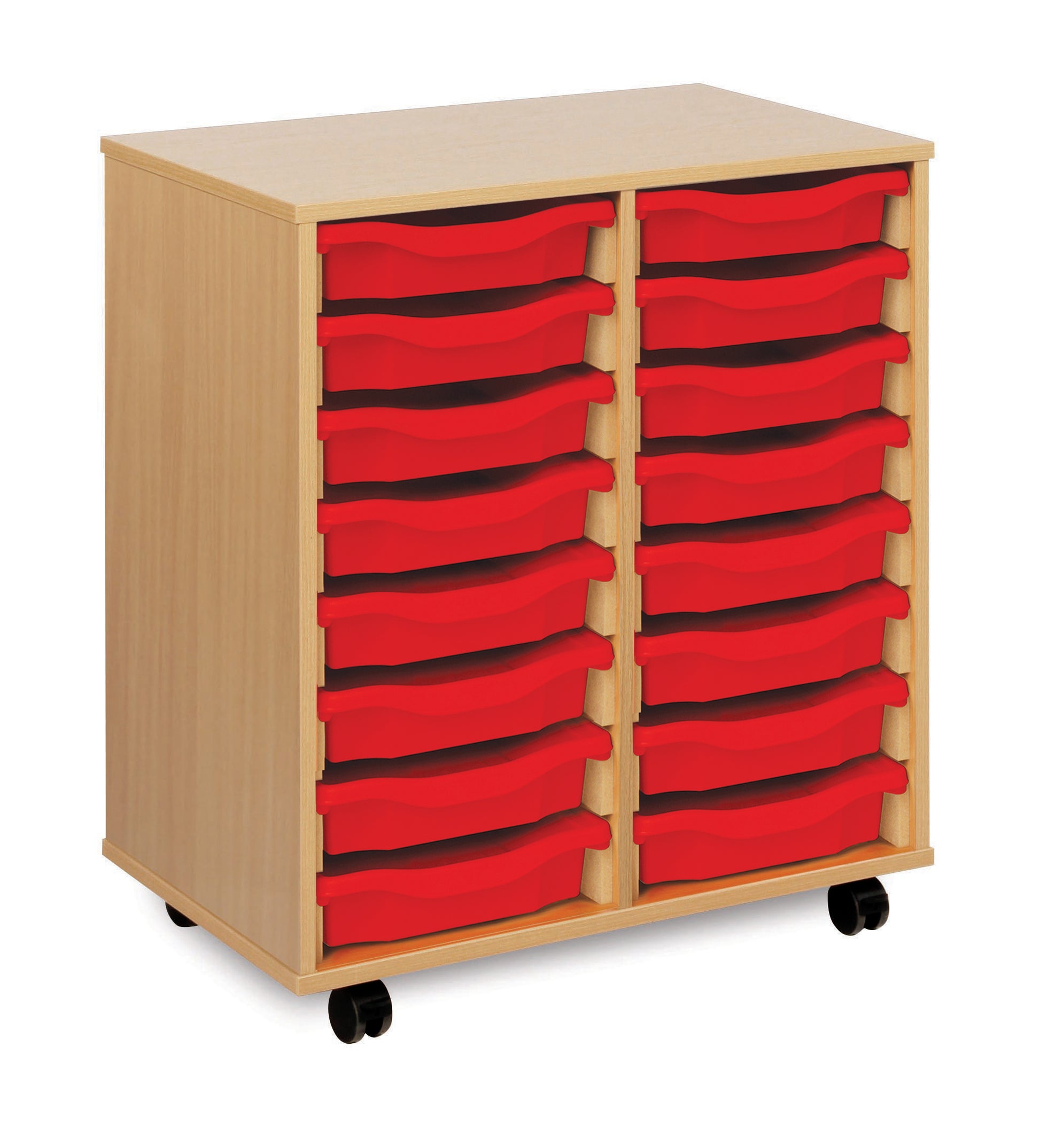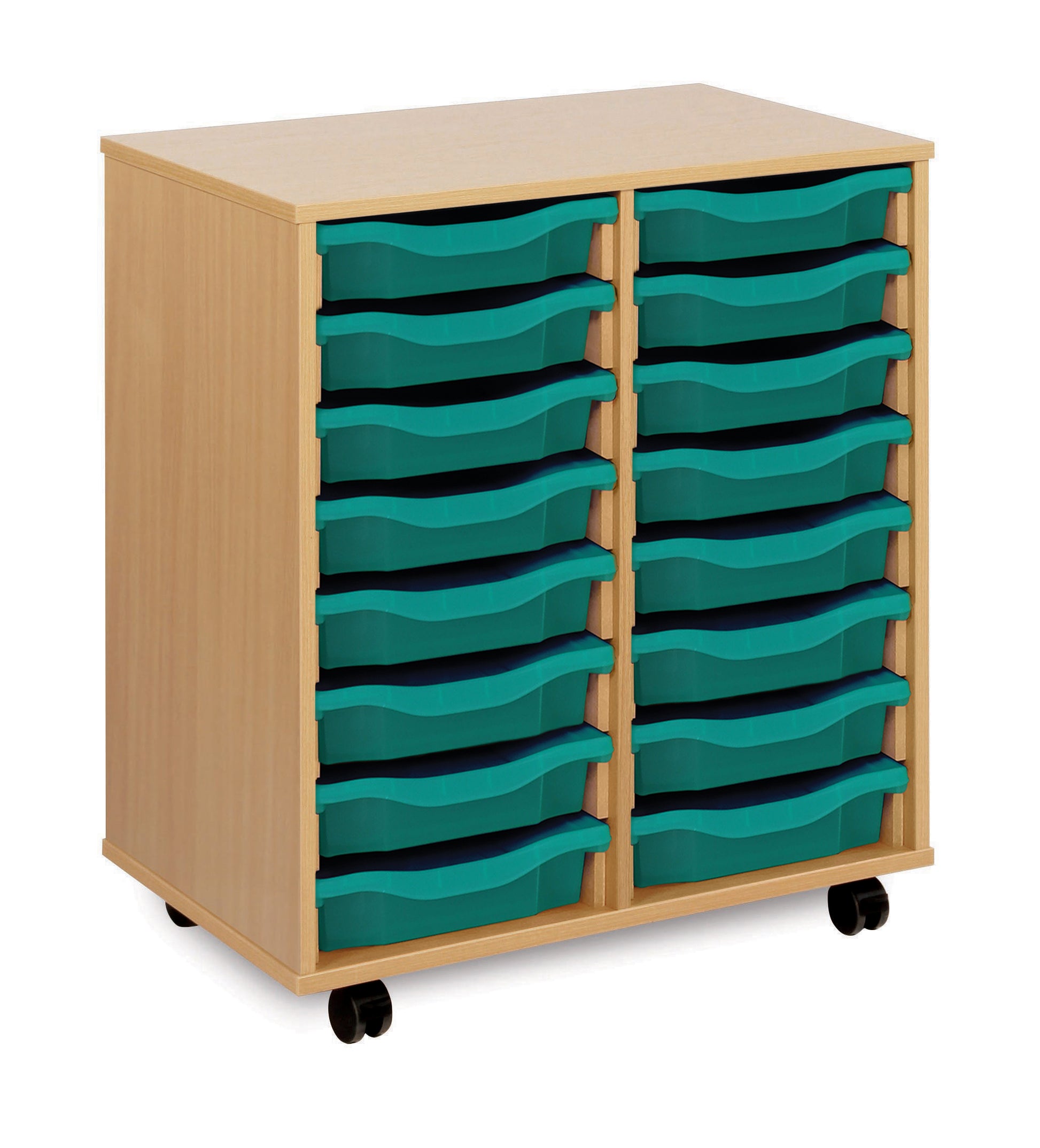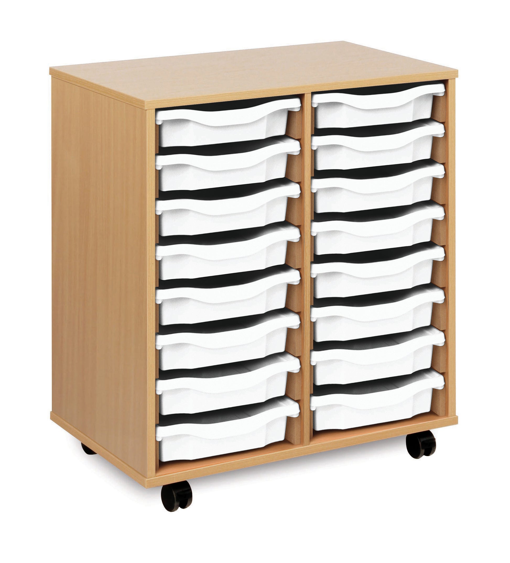 16 tray Beech MFC storage unit, mobile, complete with castors, trays and/or shelving (2 columns of 8) W700 x D453 x H789mm (inc castors)