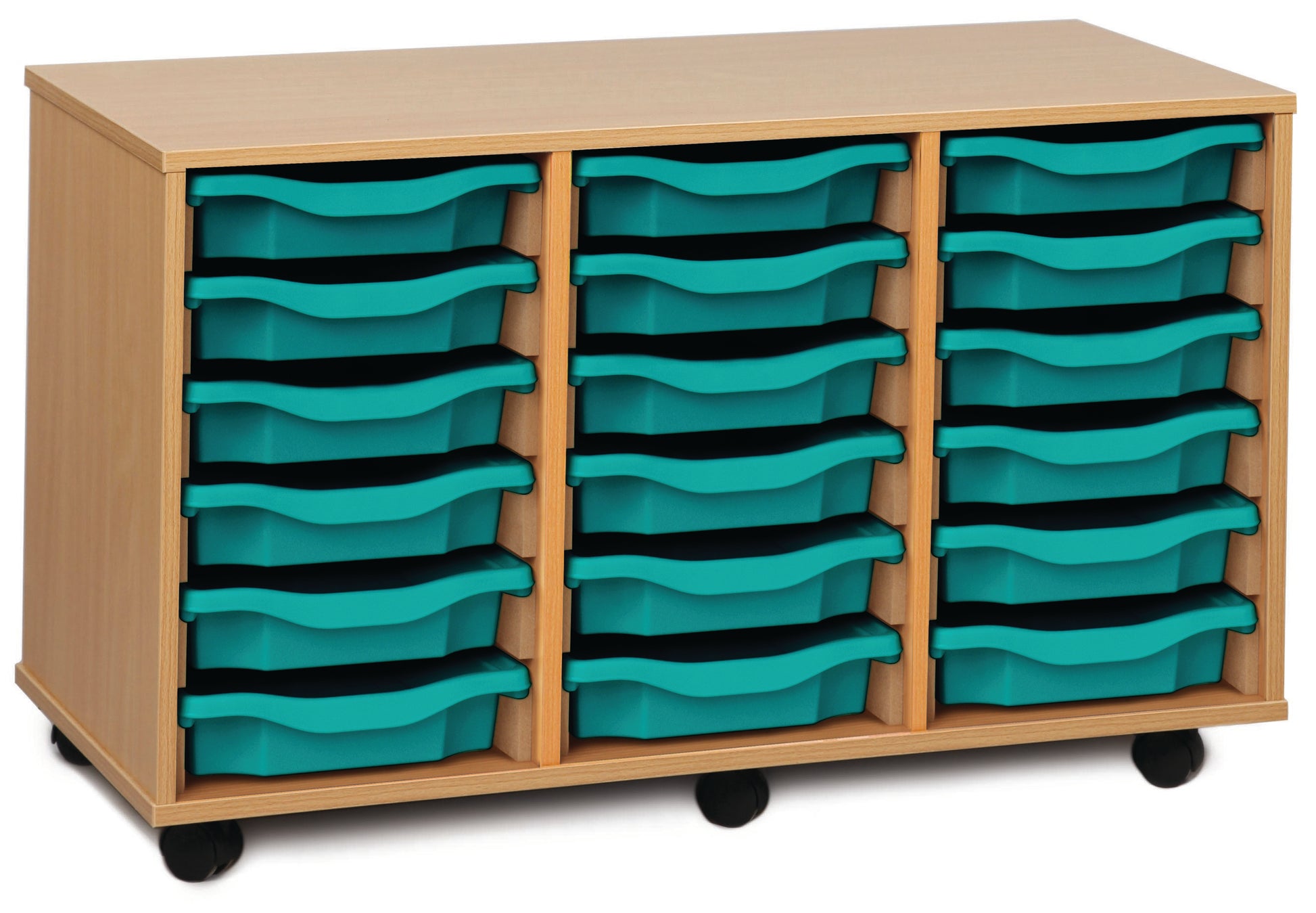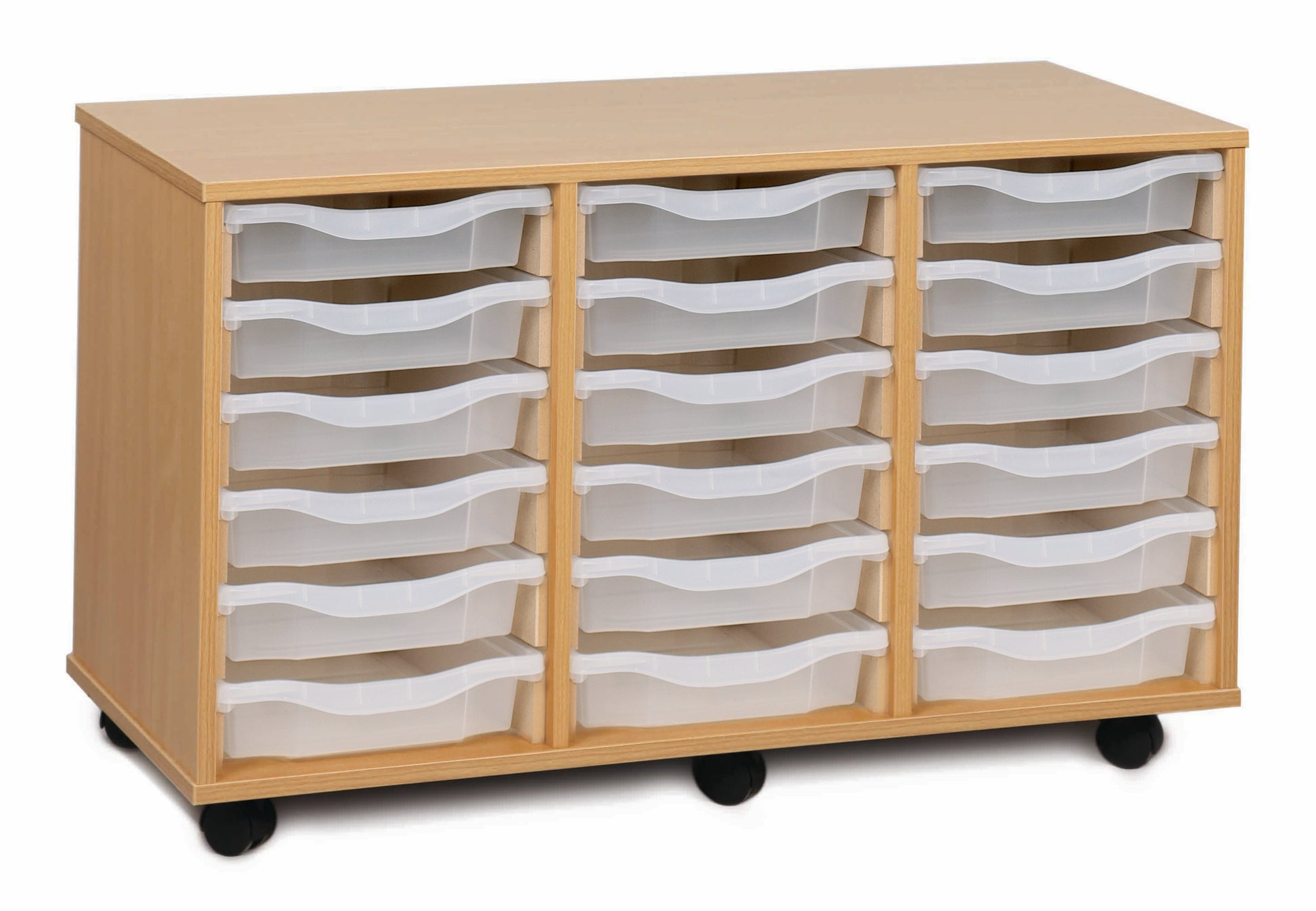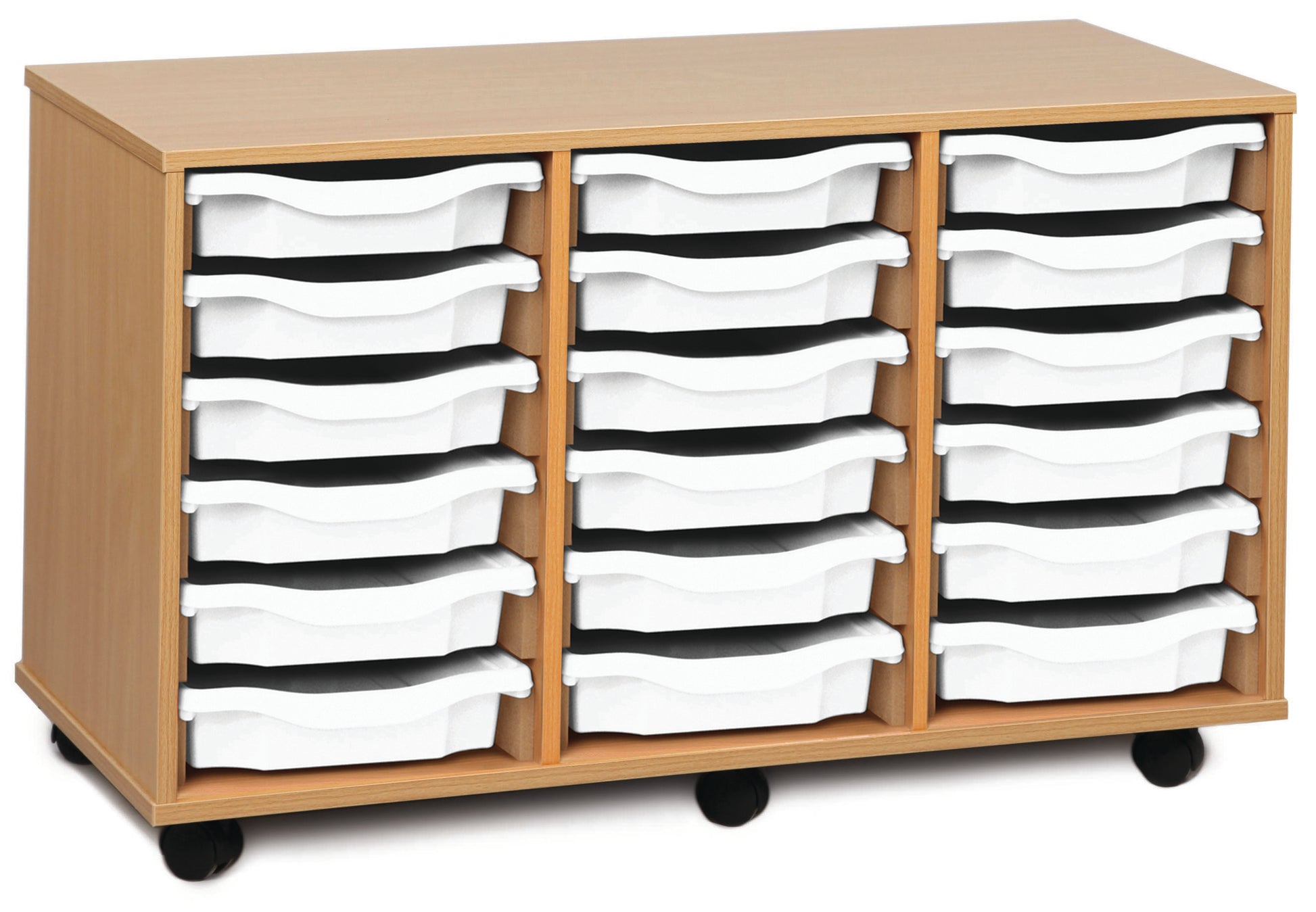 18 tray Beech MFC storage unit, complete with castors, trays and or shelves (3 columns of 6) W1030 x D453 x H617mm (inc castors)