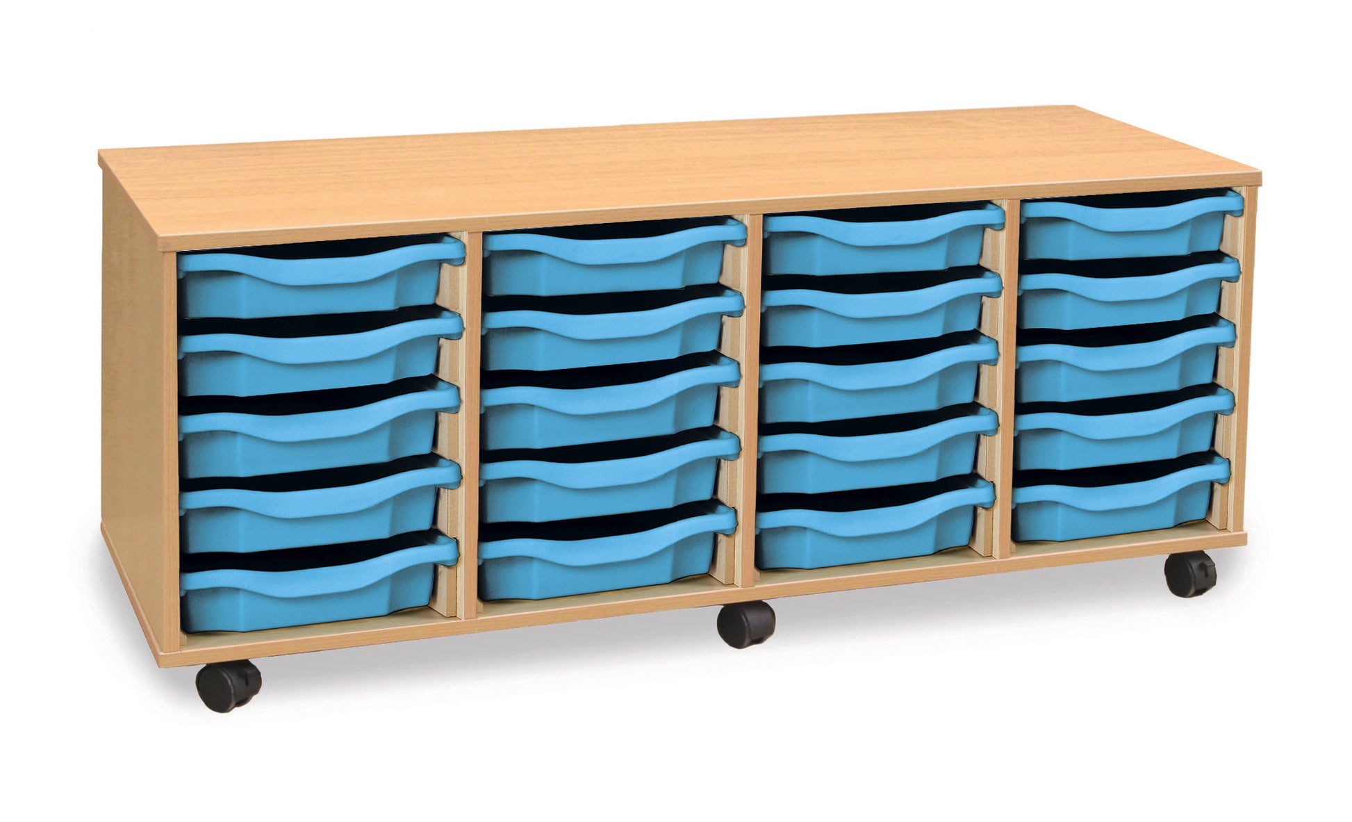 20 tray Beech MFC storage unit, complete with trays and castors (4 Stacks of 5 trays) W1358 x D462 x H531mm (inc castors)