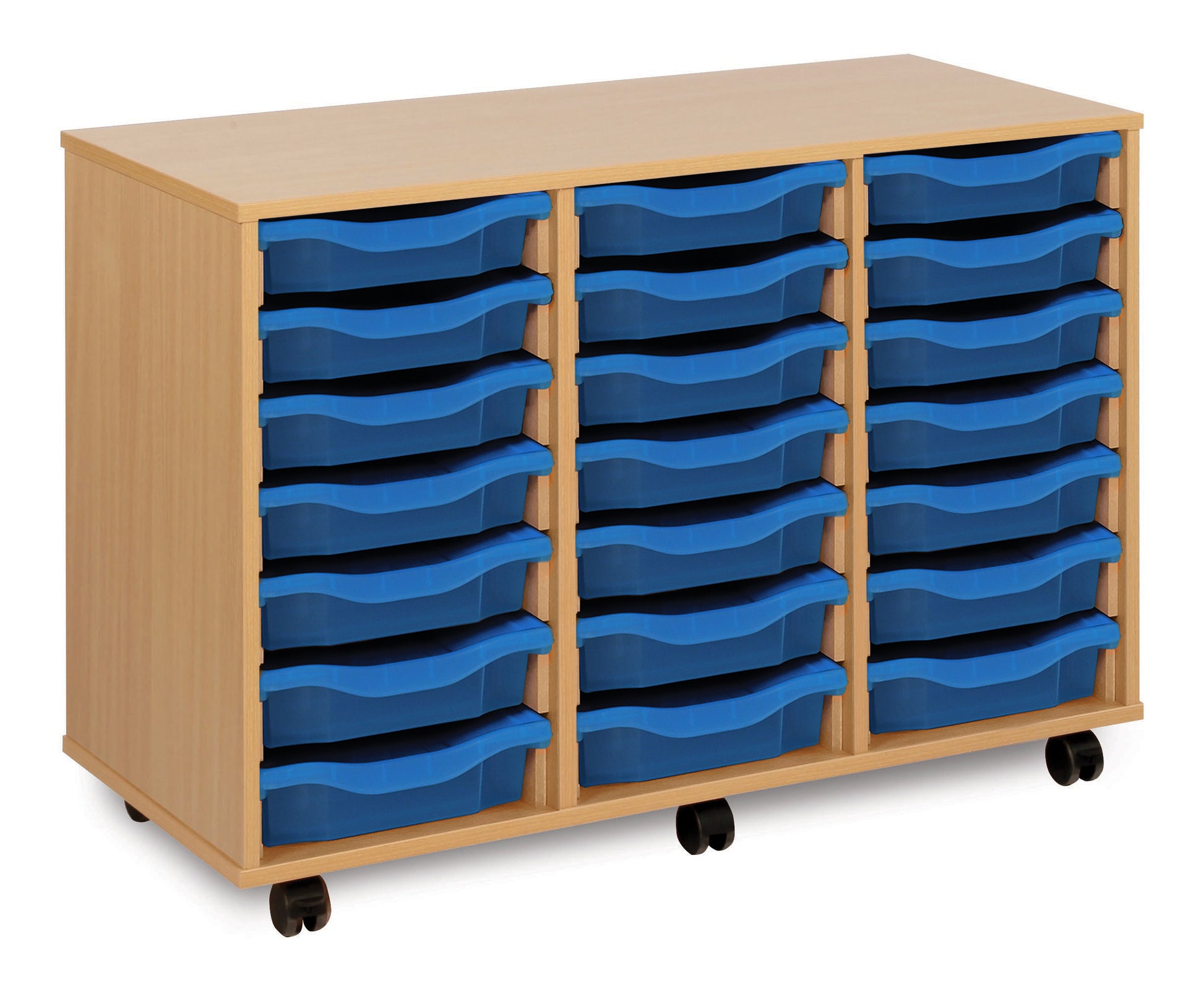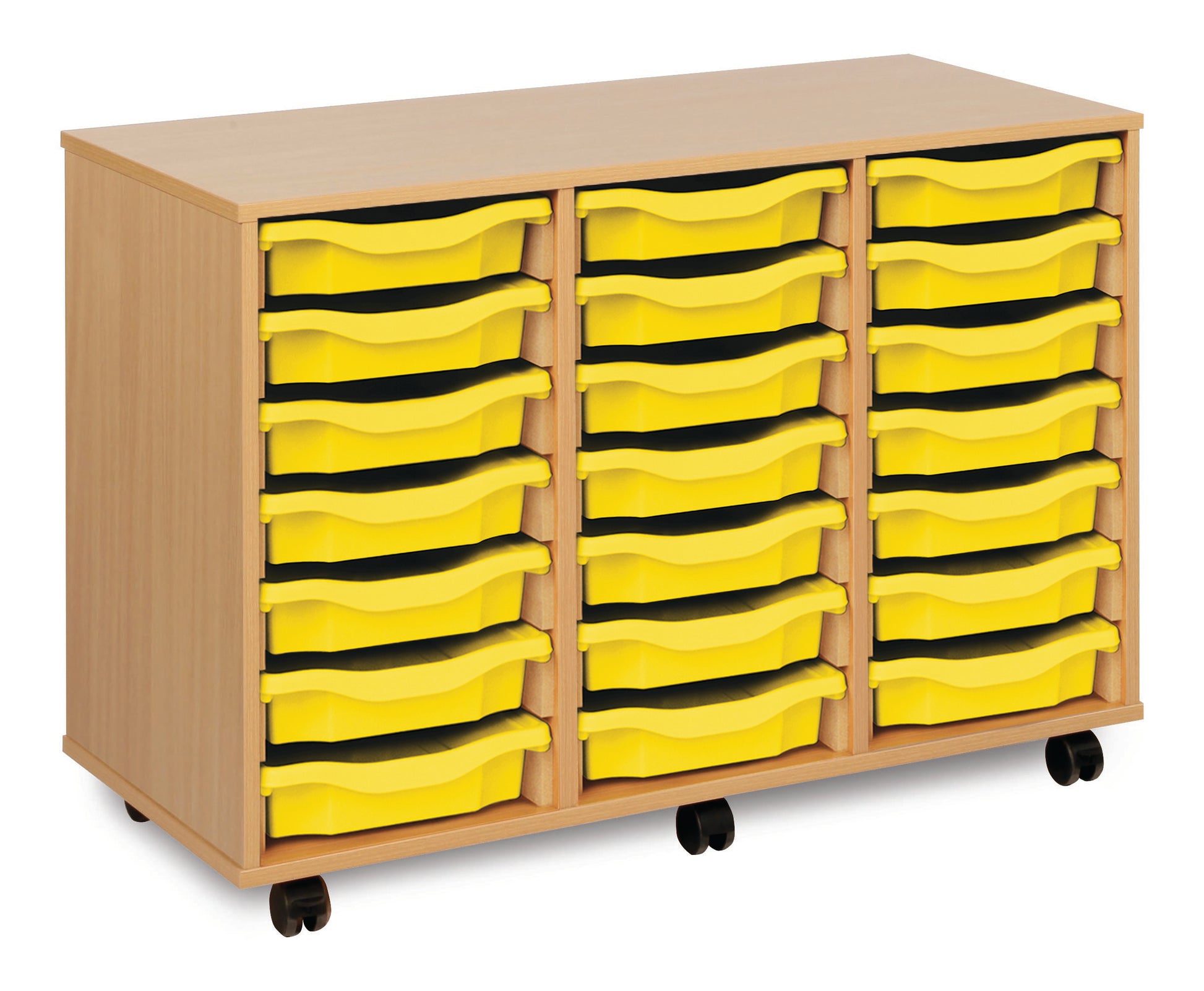 21 Tray Beech MFC storage unit, mobile, complete with castors, trays and/or shelves (3 columns of 7) W1030 x D453 x H703mm (inc castors)