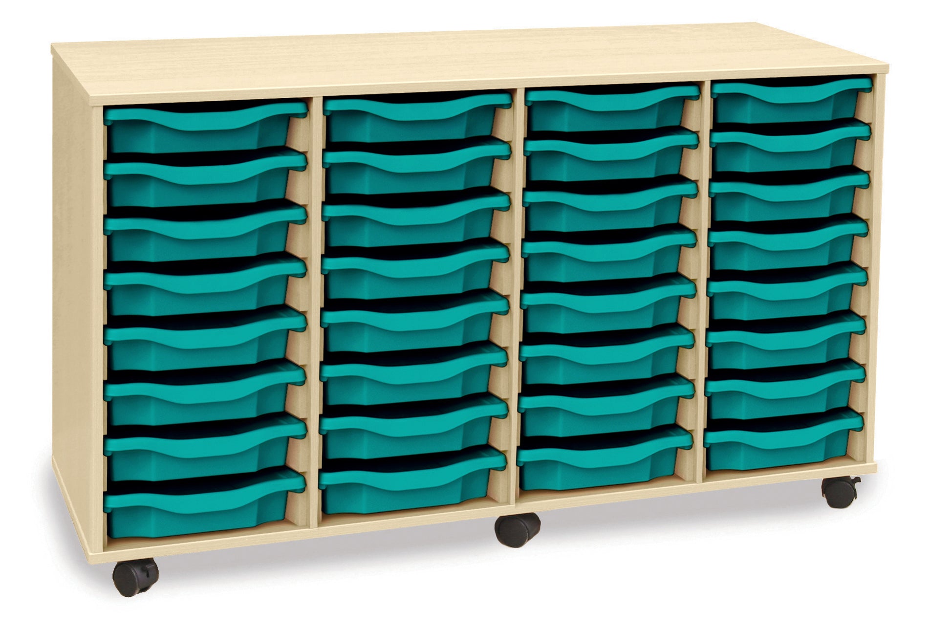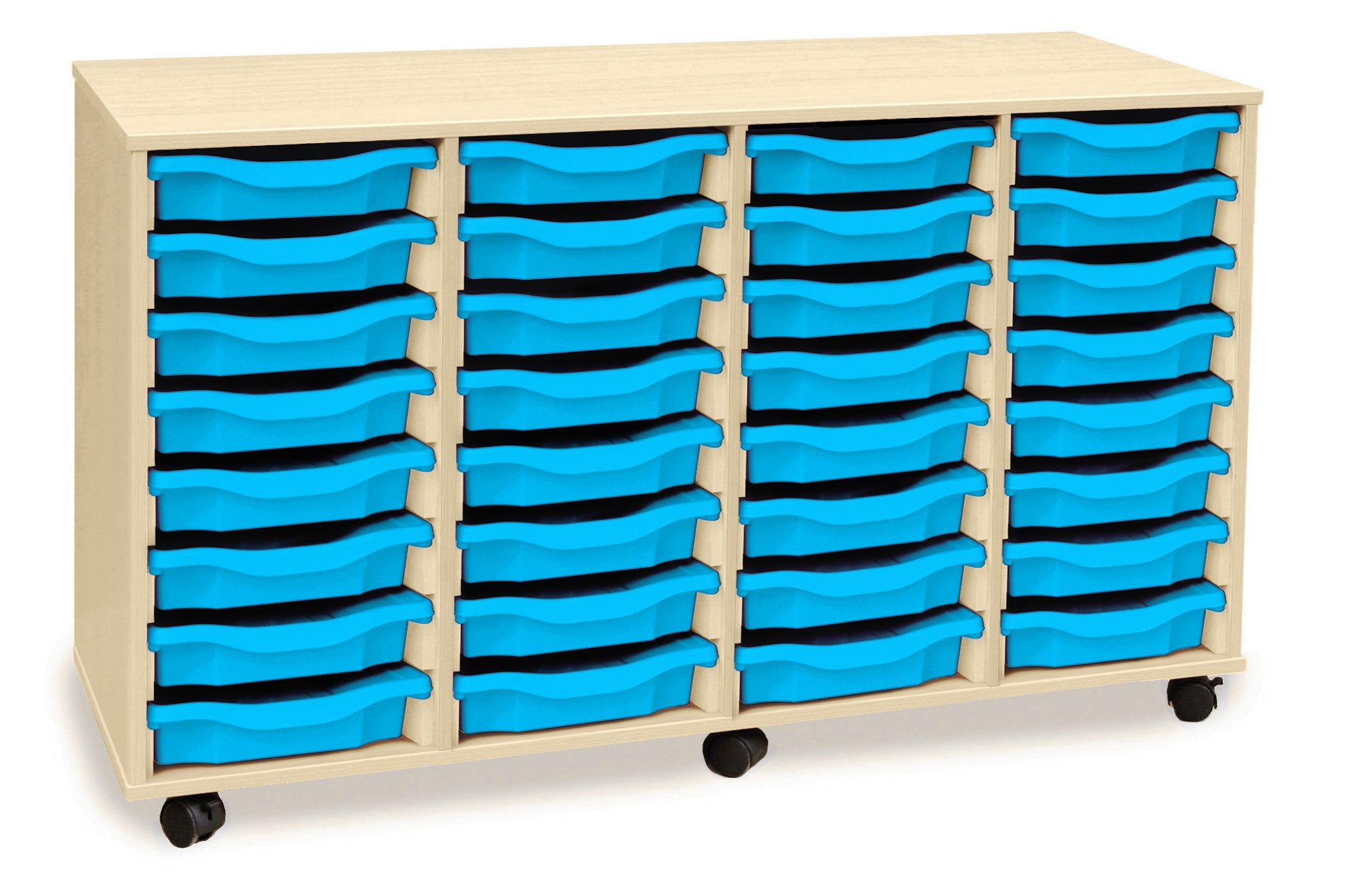 32 tray Maple MFC storage unit, complete with trays and castors (4 Stacks of 8 trays) W1358 x D462 x H789mm (inc castors)