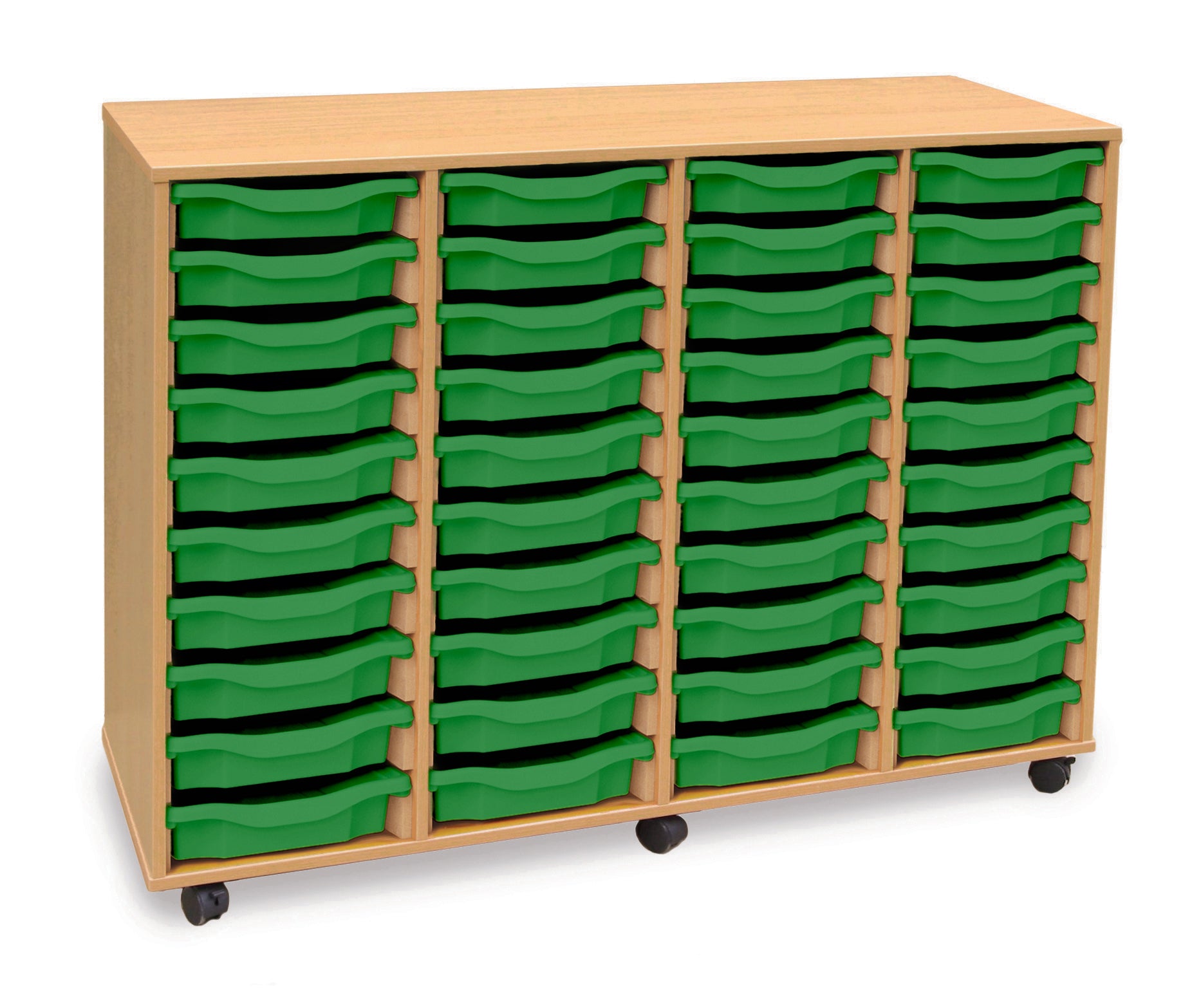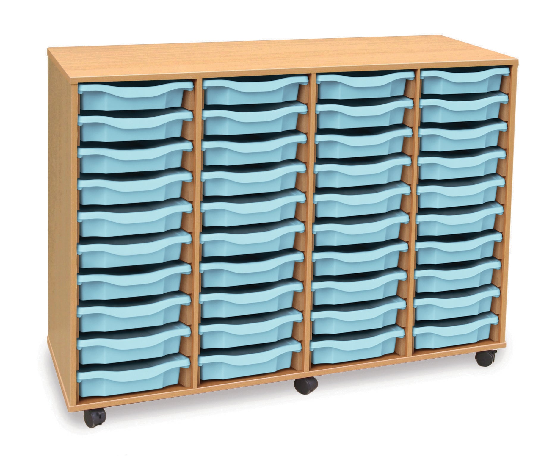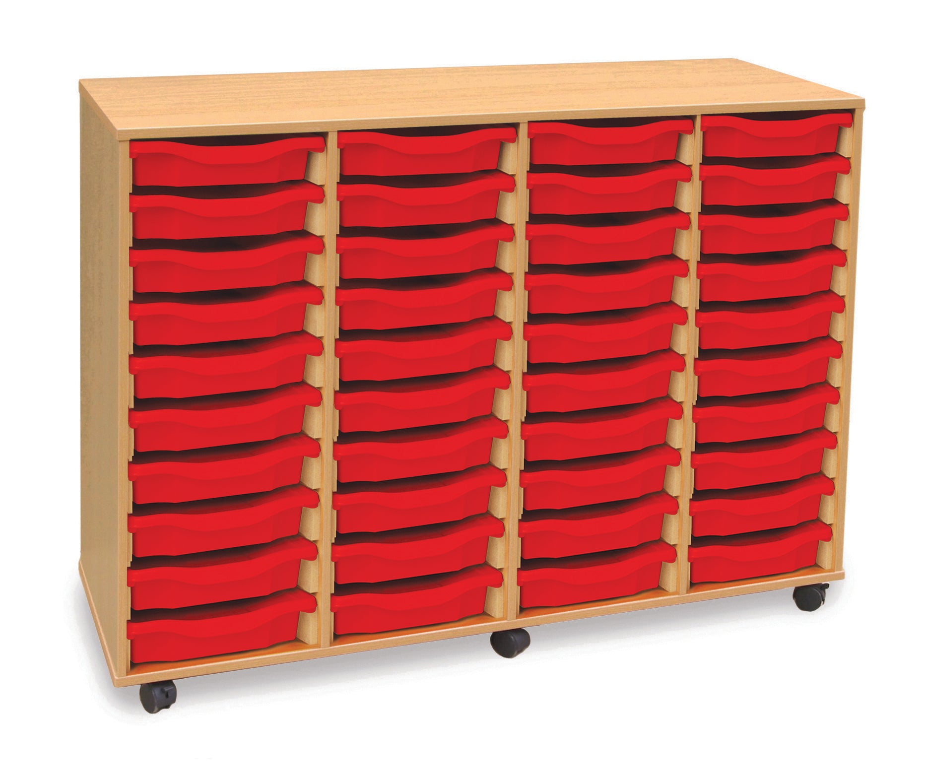 40 tray Beech MFC storage unit, complete with trays and castors (4 Stacks of 10 trays) W1358 x D462 x H961mm (inc castors)