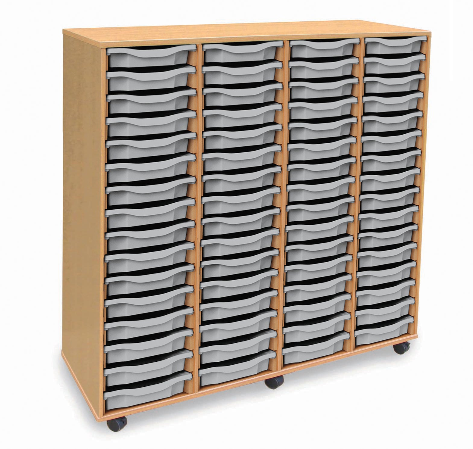 64 tray Beech MFC storage unit, mobile, complete with trays and castors (4 Stacks of 16 trays) W1358 x D462 x H1477mm (inc castors)